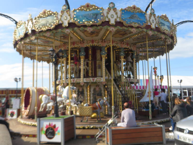 Na de hevige regenbuien van gisteren rijden we vanochtend om 8.45 uur met droog weer uit Hollandsche Rading. Rond 10.15 uur komen we bij Antwerpen in een lichte file. Nog even een koffiestop bij de parking Nazareth en dan zijn we om 12.00 uur in Frankrijk. Helaas bij Lille begint het weer te regenen en dat houdt pas op bij Abbeville. We kiezen voor de CP bij Le Treport, waar we eerder hebben gestaan en zowaar, als we er aankomen schijnt de zon!!! Het is een plek met prima voorzieningen en op loopafstand van het stadje. We wandelen erheen en het is er gezellig druk, de Fransen hebben nog vakantie. Er is een marktje met vooral kitsch en aan het eind van de boulevard staat een mooie oude draaimolen, ook staat daar een tent vol brocante. Het waait flink maar we trotseren dat en zoeken een leuk terras voor het eerste Franse drankje. Wandelen nog wat door het stadje, het is een oude vakantie bestemming van de Parijzenaars. Hier werd begin vorige eeuw een spoorlijn gerealiseerd van Parijs naar Le Treport en er werden destijds veel hotels gebouwd. Je ziet nog veel restanten van die oude bebouwing en helaas is er veel in verval. In de haven liggen een flink aantal vissersboten en de oude visafslag is mooi gerestaureerd. Het is jammer, de accu van het fototoestel is leeg dus we hebben niet veel beelden.
