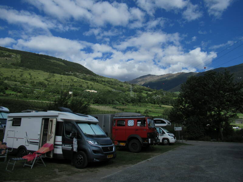 Richting Merano wat weer een mooie weg is, het is wel redelijk druk met verkeer op de vrij smalle weg. Overal zien we appelboomgaarden waar nu al veel appeltjes aan hangen. Sommige dorpen die we passeren zijn toeristisch en er zijn veel hotels. Dan bij Merano wat een mooie historische stad is gaan we richting Bolzano. We blijven de SS38 rijden en ook bij Bolzano nemen we geen autostrada, niet alleen vanwege het bedrag aan tol, maar ook omdat de weg de SS12, die ernaast loopt prachtig is, er zijn veel tunnenls door de bergen en rechts van ons stroomt de rivier. Dan naderen we Trento, daar is het drukker maar er loopt een redelijke rondweg langs. Bij Verona moeten we even zoeken eer we de weg hebben gevonden naar Ferrara, er lopen rond die stad zoveel wegen en niet alles wordt goed aangegeven. Maar uiteindelijk op de goeie weg de SS 434. Nu gaan we een landbouwgebied in,er wordt heel veel fruit geteelt, en rond een uur of 2 vinden we de CP in Castelguglielmo (wat een naam!) een fantastische plek,iedere plaats heeft een eigen kraan, stroomaansluiting en een sani station. Langs de kant staan wat bomen waardoor we ook schaduw hebben, en het is ook nog helemaal gratis.