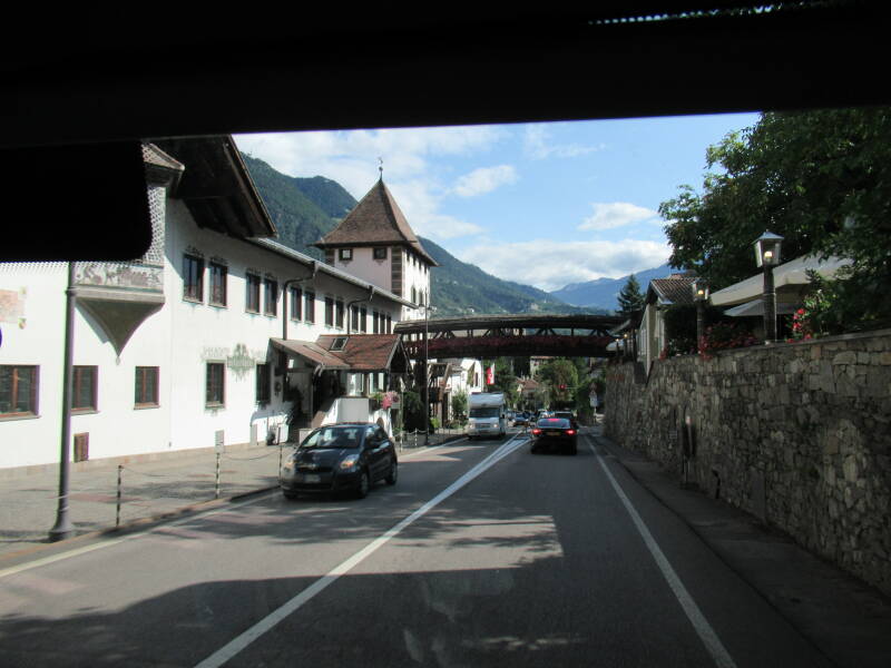 Allereerst gaan we hier boodschappen doen. Rond de CP zijn de Lidl, Aldi, een drankensuper en verschillende andere zaken te vinden. Bij de Lidl slaan we in en bij de schoenenwinkel konden we niet naar binnen omdat we niet het juiste voorgeschreven mondkapje hadden. Het is 11 uur als we vertrekken en gaan richting Oostenrijk. Het is een prachtige rit richting de Fernpass, maar ook nu weer veel oponthoud door werkwerkzaamheden. Bij Imst gaan we de weg nr. 171 volgen en hoeven dan geen vignet te kopen. Ook nu weer veel natuurschoon en bij Landeck aangekomen wordt aangegeven dat de weg richting de Reschenpass is afgesloten. Dus omdraaien en bij een benzinestation gestopt omdat we misschien toch een vignet moeten kopen. We tanken hier gelijk maar, vergeleken met Duitsland is de prijs van de diesel aanmerkelijk goedkoper. In Duitsland plm. € 1,69 en hier € 1,27 per liter. We informeren naar het vignet en we hoeven dat niet te kopen i.v.m. de wegafsluiting. Dan de A12 op en de Landecker tunnel in. We rijden verder naar het zuiden over de weg nr. 180 en nu wordt het oponthoud veroorzaakt door landbouwtractoren. Dus we kunnen volop genieten van het natuurschoon. Via P4night hebben we een CP gevonden bij een camping in Glurns/Glorenza. Het is een leuke plek direct naast een zeer luxe camping Gloria Vallis waar een speciaal stuks is voor campers met stroom, water, sanitair en een WC. Kost wel € 20 voor 1 nacht. Langer kun je er niet staan of je moet naar de camping. Het weer klaart op, er is wel een behoorlijk harde wind maar we kunnen buiten zitten, lekker in de zon!!!