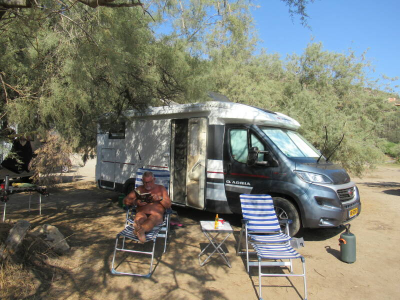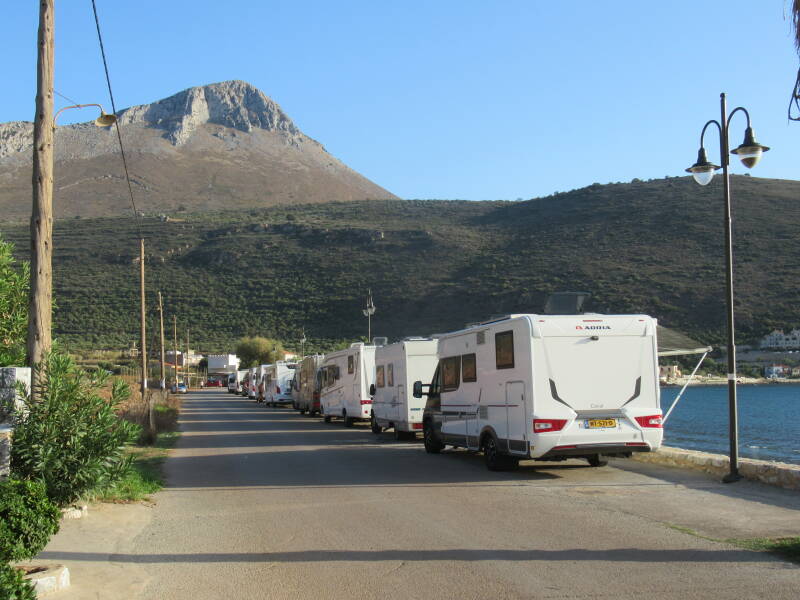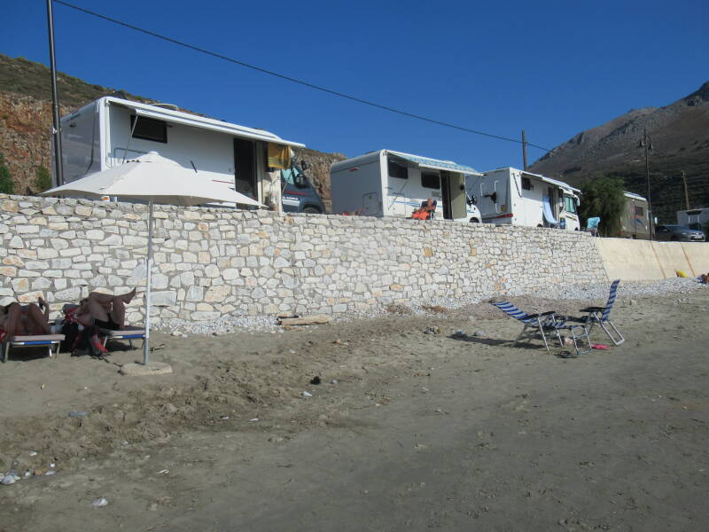 Verder was het vandaag weer een komen en gaan van campers, allerlei nationaliteiten, vooral Duits, maar ook Engels, Frans, Bulgaars, Hongaars en natuurlijk ook Nederlanders. De Grieken komen met de auto hierheen om te baden, en ook veel huurauto's met toeristen.