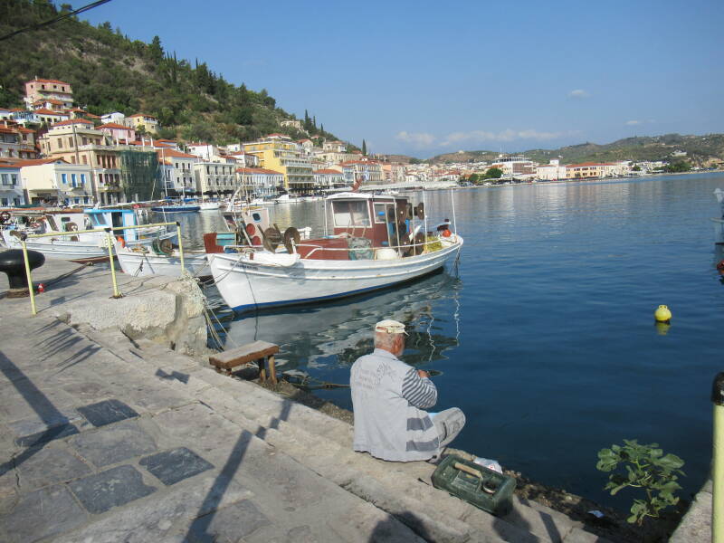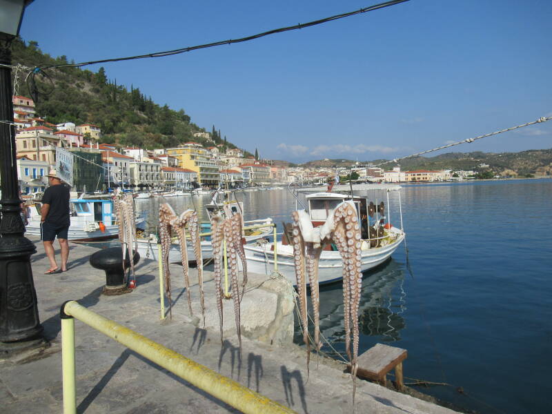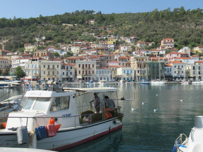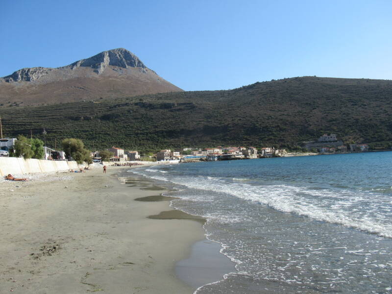 Daar gaan we weer, via Areopoli, een grote plaats met allerlei voorzieningen, zoals een ziekenhuis, rijden we een ander landschap in. Het is minder bergachtig en er staan veel olijf- en fruitbomen. Een km of 20 voor Gythio belanden we in een horrorfilm, de recente branden hebben hier veel verwoest. Veel van de olijfbomen en eucalyptusbomen zijn verbrand, het is een trieste aanblik als we er doorheen rijden. Gelukkig zijn de meeste huizen gespaard gebleven, we zien een enkel platgebrand huis en veel schuren zijn verdwenen. We komen dichterbij Gythio en we hebben destijds gezien dat de campings die hier zijn moesten worden ontruimd. Vlak voor Gythio wordt het weer groener en we parkeren bij de haven en lopen het stadje in. Het is een leuke plaats, veel vissersbootjes en ook heel veel terrassen en restaurants. We zoeken de bekende bakker en gaan voor het lekkere brood dat ze hier hebben en bezwijken voor een bougatsa, heerlijk!!! Dan een frappé op een terras met uitzicht op de haven. Jo en Nick zijn ook aangekomen en volgens ons voorbeeld. Dan op naar het strand met het scheepswrak waar we natuurlijk ook al eerder hebben gestaan. Hieraan hebben we goeie herinneringen, er stonden toen een zestal campers. Dus nu was het even schrikken, heel wat meer, maar wij vinden gelukkig een mooi plekje met uitzicht op het strand en de zee.