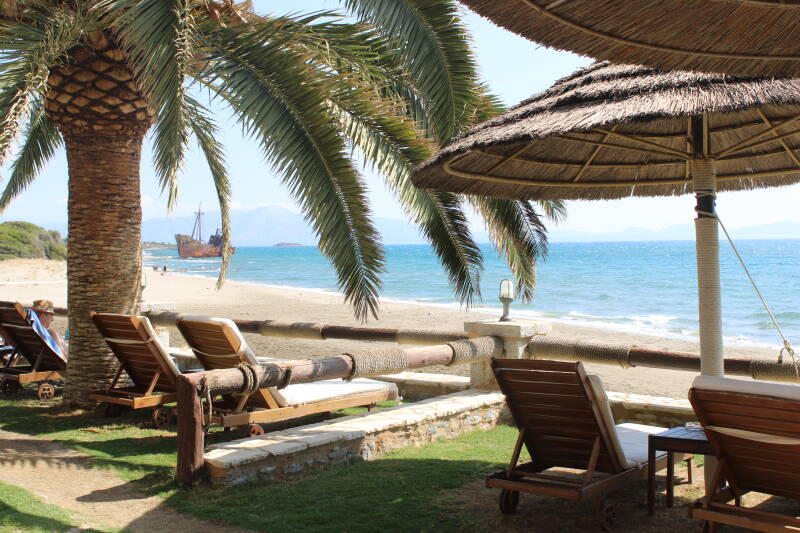Op het mooie terrein is niet veel veranderd, het restaurant dat hier is heeft uitgebreid en ziet er prachtig uit. Mooie terrassen met ligbedden, een strandbar en een goed restaurant. We gaan er een biertje drinken en genieten van het mooie uitzicht op het strand met het wrak. We ontmoeten de eigenaar, opnieuw weer een vriendelijke ontvangst. De eerdere keer dat we hier waren was het restaurant nog gesloten. We mochten toen wel water halen en hij bracht ons zelfs sinasappelen. Nu is er een douche op het strand. Later in de middag loopt het op het terrein weer vol met campers, waarvan de meesten s'morgens weer vertrekken. Ook komen er veel toeristen in huurauto's hier zwemmen en het wrak bewonderen.