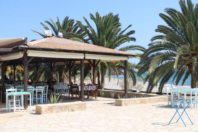 We installeren ons aan het strand bij Neo Itylo aan een prachtige baai. Het is heerlijk weer, volop zon, een windje erbij en zo houden we het wel uit. Je kunt heerlijk zwemmen en zelfs ik waag een plonsje!!! Er is een prachtige zonsondergang en daarna lopen we naar het leuke restaurant aan het eind van het strand. Leuke ontvangst en opnieuw heerlijk eten, er wordt lekker muziek gedraaid en we genieten opnieuw.
