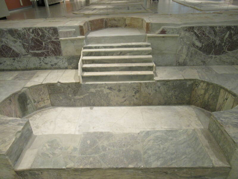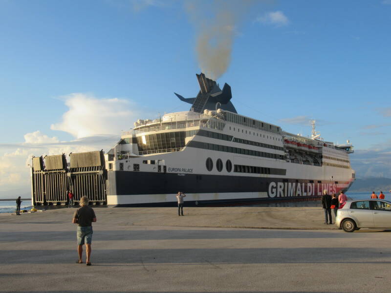 Na het afrekenen vertrekken we van de camping richting Patras, al snel vinden we het museum. Ook de buitenkant is mooi maar binnen overtreft het onze verwachting. Grote zalen met veel vondsten uit Patras en omgeving. Vooral de grote mozaieken zijn prachtig. De uitleg die erbij wordt gegeven is prima, soms met video beelden die een goed beeld geven van de erfenis van de Romeinen. Gebruiksvoorwerpen, zoals gereedschap, keukengerei potten, schalen en amfora's. Ook zijn er veel sieraden te bewonderen en prachtige kleine glazen parfumflesjes. Er is een afdeling met sarcofagen waarin soms nog een gevonden skelet ligt. Hier wordt strikt gevolg gegeven aan de corona maatregelen, verplicht het masker op!!!! Daarna rijden we richting de haven waar we bijtijds arriveren. We moeten nieuwe tickets ophalen bij Grimaldi omdat we eerder vertrekken dan we hadden geboekt.. Na een poosje lukte dat en we moeten € 95,00 bijbetalen. Dan naar de vertrekpier, de ferry zou om 18.00 uur vertrekken maar er werd ons medegedeeld dat het 1,5 uur later zou zijn. Tegen 20.00 uur kwam de ferry aan en werden de vrachtauto's en wat campers gelost. We hebben met belangstelling gekeken hoe het schip daarna weer werd volgepakt, ongelooflijk wat een vrachtauto's erop gaan. Het eist heel wat behendigheid van de chauffeurs om de dekken op te rijden. Voor het onderste dek moeten ze achteruit rijden. Er kwam geen eind aan en eindelijk tegen 21.00 uur konden de campers erop, het waren er niet zoveel als gebruikelijk. Nadat we een sleutelkaart voor de hut hadden gekregen zijn we nog een hapje gaan eten in het restaurant. Daarna lekker naar de hut en plat.