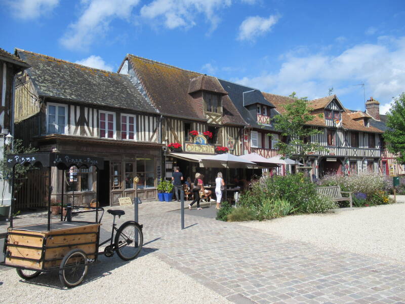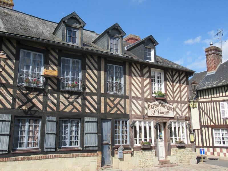 Ons doel is Beuvron-en-Auge, een plaatsje dat bekend staat als “une de plus belle villages de France”. Vanaf Honfleur rijden we eerst richting Pont-l'Eveque, van de beroemde kaas. Het is een leuke stad, met heel veel mooie vakwerk huizen. Dan via de D16 waar heel veel appelboomgaarden zijn voor de bekende calvados die ook overal te koop wordt aangeboden. We bereiken Beuvron en gaan naar de CP daar. Een mooie en rustige plek. Van daar lopen we naar het dorp, bij het kunstenaarscentrum kopen we een ticket voor de CP, even langs het toeristenbureau en gaan dan het dorp bewonderen.