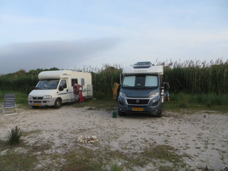 De stank van de olie werd steeds sterker en op het schoongemaakte strand spoelen bossen zeegras vol olie aan. We gaan verder, Albanië wacht op ons. In Igoumenitsa gaan we weer inslaan bij de Lidl en rijden dan naar Sagiada. Daar even gezocht naar een mooi plekje en dat ging goed lukken. Direct aan het strand op een grasveld, douche en kraan voor onze neus, wat wil je nog meer!!! Ja, de zon en die is er volop. Hier lopen geregeld grote kudde's schapen langs, we maken een praatje met de herder die uit Albanië komt. Ook zijn er geregeld loslopende koeien die blijkbaar hun eigen weg vinden. Er staan een paar campers en in de loop van de dag komen er wat bij, totaal zo'n 14 stuks. We kunnen nog heel lang buiten zitten, zo warm was het tot nu toe niet s' avonds. Er is een vuurplekje aan het strandje waar Rob later een vuurtje maakt. We zien de lichtjes op Korfoe aangaan, dat hier tegenover ligt. Een ideaal plekje en we besluiten nog er maar een dag aan vast te knopen.