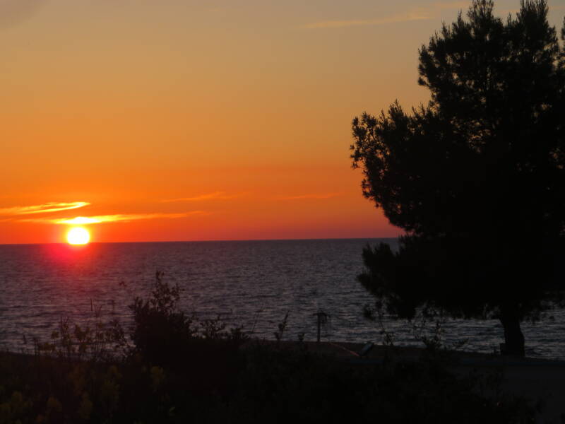 Rob is jarig vandaag en wordt 80!!! Er komen heel wat telefoontjes en app-jes binnen. Wij starten de motoren en zijn al snel bij de grens, er wordt even naar de papieren gekeken en we kunnen snel doorrijden. De navigatie stellen we in op Butrint en nemen dan waarschijnlijk toch een verkeerde afslag en komen op een landweggetje uit dat naar de middle of no where leidt. Bij een krakkemikkig huis vragen we de weg en inderdaad we zitten fout. Dus even terug en komen dan op de goeie weg die naar Butrint gaat. Ook niet echt een beste weg maar ons doel komt in zicht. Nu nog even de oversteek maken met een pontje dat wel uit de binnenlanden van Afrika lijkt geïmporteerd!!! Een soort houten vlot dat wordt voortgetrokken door twee kabels, maar de campers gaan erop en we komen heelhuids aan op de andere kant. Daar is een grote parkeerplaats en de entree naar de opgravingen van Butrint. Al sinds 167 voor Christus was hier een nederzetting met een welvarende handelsstad. Vanaf de 5e eeuw waren er invallen van de Vandalen en de Goten die veel verwoestingen aanrichten. Daarna kwam het onder Byzantijns gezag en werd christelijk tot in 1081 de Noormannen de stad veroverden en er werd geplunderd en brand gesticht. In 1386 veroverden de Venetianen de overblijfselen en verstevigden de stadsmuren en gebruikten de stad als overnachtingsplaats voor de handelaren die reisden tussen Venetië en de Levant. Regelmatig waren er kleine oorlogen met de Ottomanen, die het gebied veroverden en kwam het in 1797 in Turkse handen, die er een fort lieten aanleggen. In 1928 kreeg het opnieuw betekenis omdat Italiaanse archeologen het gebied ontdekten en aan de opgravingen begonnen die nog steeds voortduren. Sinds 1992 staat het op de werelderfgoed lijst van Unesco. ( Dank zij een artikel van Paul Wennekes in Camper reismagazine, waar we deze informatie vonden). Heel wat geschiedenis en prachtige restanten van het verleden. Zeer de moeite van het bezichtigen waard. We waren er al vroeg, voordat de grote toeristische stroom op gang kwam. Het ligt op een heuvel met prachtige bomen en rondom mooie vergezichten op het meer rondom Butrint. We gaan op zoek naar een camping in Ksamil en rijden door een rommelige stad vol restaurantjes, van de uitgezochte camping Paradise geen spoor dus even door en net buiten de stad vinden we camping Sunset, een prima plek, alles erop en er aan voor slechts 10 euro. We worden hartelijk begroet en zoeken een plekje, weer met een mooi uitzicht. Er is een restaurant bij en we gaan er lunchen. De kaart lijkt op de Griekse kaart maar het eten is totaal anders net als de wijn, die is hier heerlijk!!! Het is prachtig hier op de camping Sunset, de zonsondergang. Het is helder, dus we zien de zon mooi in de zee ondergaan.