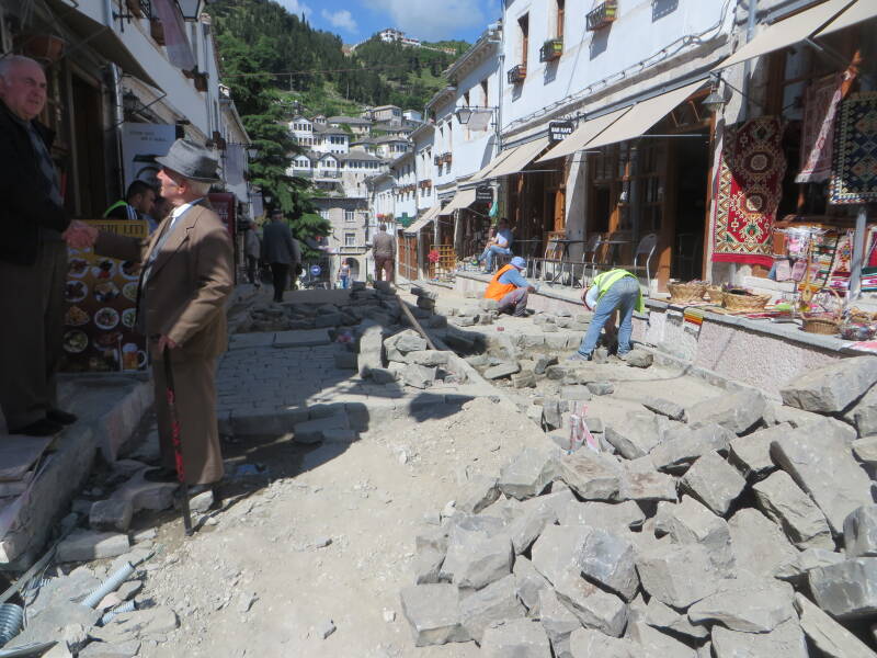 We worden door Luca, de zoon van de eigenaar met de auto naar het centrum van Girokaster gebracht. Allereerst op zoek naar een nieuw geheugenkaartje voor Nick, dat al gauw was gevonden. Het is dan makkelijk als er iemand is die de weg weet. Hij zet ons af voor de toeristen informatie waar we wat documentatie ophalen. Te voet omhoog gelopen naar het kasteel/citadel dat erg doet denken aan de citadel in Aleppo. Het is een prachtig gebouw boven op een rots met een weids uitzicht over de oude stad. In de schemerduistere gaanderijen staan allerlei kanonnen opgesteld, vnl uit de 2e Wereldoorlog die destijds zijn buitgemaakt op de Italianen, Grieken en Duitsers. Aan de buitenzijde zijn allerlei bunkerachtige ruimtes waar de kogels werden opgeslagen en een groot terrein waar geregeld festivals worden gehouden. Ook zien we een klein huisje dat dienst doet als grafkelder met twee grafzerken van Baba's die vol liggen met bloemen en aan de buitenzijde van dat huisje branden permanent kaarsen. We lopen langzaam naar beneden langs het oude Girokaster en door de bazaar. Helaas is het wat rommelig, men is bezig de bestrating in oude ere te herstellen. Al lopend door het oude deel van de stad zien we mooie oude huizen en dat van de schrijver Ismail Kadare springt eruit. Hij heeft vele politie getinte boeken geschreven en is zelfs in 2005 genomineerd voor de Nobelprijs en heeft daarnaast vele literaire prijzen gewonnen. Een grootheid in Albanië. Nadat we door vele straatjes zijn afgedaald komen we in het modernere deel van Girokaster. We hebben dorst en trek en gaan een simpel hapje eten. Shish Kebab en Köfte, lekker wijntje erbij en we kunnen weer verder. We bellen onze “taxi” en Luca verschijnt snel en brengt ons weer naar de camping, wat een service. Later in de middag vallen er een paar flinke buien, verder was het goed weer.