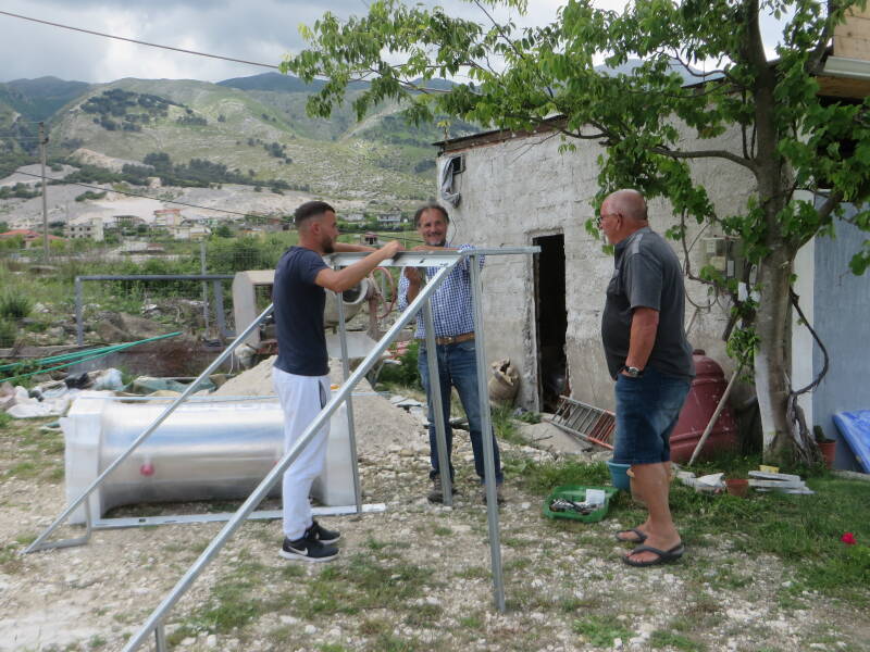 Het uur tijdsverschil met Griekenland is al goed te merken, we zijn vroeg wakker gemaakt door de zon en starten onze tocht richting Girokaster. Allereerst gaan we wat Lek's pinnen in Ksamil, euro's worden wel geaccepteerd maar voor kleine bedragen is het makkelijker wat Albanees geld te hebben. Het eerste stuk weg richting Sarande is goed en loopt langs de kust, dan via de SH99 naar Girokaster. Onderweg rijden we naar Syri i Kalter, waar de blauwe bron ligt, een bezienswaardigheid. De weg erheen is vol gaten en hobbels, maar er rijden ook grote bussen heen dus dat gaat ons ook lukken. Na zo'n 2 km zijn we bij de parkeerplaats en lopen naar de bron, het is er heel mooi, dicht begroeid met veel planten en bomen, het lijkt wel een jungle. Overal stromend water en na een kleine wandeling bereiken we de bron. We zijn niet de enigen, het is blijkbaar een geliefde plek voor een schoolreisje, bussen vol jongelui. We zien de bron, het water is kristal helder en mooi blauw van kleur. Het borrelt naar boven en de temperatuur van het water is contant 12 graden, wel is het verboden erin te baden. We genieten ervan en gaan weer de weg naar de camper om de route naar Girokaster voort te zetten. Dan begint het echt goed, een prachtige maar zeer bochtige weg door een schitterend berglandschap. Totaal verlaten met hier en daar een vrouwtje langs de weg die wat kersen verkopen. Na ruim 30 km kronkelen, haarspeldbochten, omhoog en omlaag, bereiken we de weg naar Girokaster, een mooie asfaltweg die door een groot dal loopt. Het is opvallend dat er zoveel geraamtes van bouwsels zijn, ook de verlaten brandstofstations zijn er volop. Daarnaast komen er, naarmate we de stad naderen, steeds meer moderne gebouwen en restaurants te voorschijn. De stad ligt mooi in het dal, omgeven door hoge bergen waar hier en daar nog sneeuw op ligt. Net buiten de stad vinden we de camping, een grote verrassing, we worden bijzonder hartelijk welkom geheten en men laat ons zien wat er allemaal is. Het zijn mooie plaatsen met elk een eigen kraan, elektra en afvalwater mogelijkheid. Ook is er een bar met koffie en drank, direct daarnaast is een fantastische sanitaire ruimte, mooie douches, wc's en alles is net nieuw en brandschoon. Bij onze vraag of er een taverna in de buurt is zegt de zoon van de eigenaar (die goed Engels spreekt) dat zijn moeder voor ons kan koken, een echte Albanese maaltijd. Vanavond gaan we daar voor. Als we de bezienswaardigheden in de stad willen bezoeken wordt aangeboden ons er met de auto heen te brengen. Het moet een mooie stad zijn, een van de oudste van Albanië. Gaan we morgen doen, nu is het te warm om in de stad te lopen. De maaltiijd was heerlijk, mamma had echt haar best gedaan, maar het was heel veel!! Allereerst een kippensoepje met citroen en op tafel kwam allerlei lekkers, salade, burek(bladerdeeg met kaas), gevulde aubergines uit de oven, zadziki, lapje gebraden rundvlees en brood. Erbij een heerlijke rode en witte wijn. Toe was er een ingemaakte appel in siroop met kruidnagel. Tot slot een kopje koffie. Eigenlijk teveel, een deel was over.