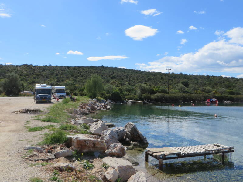 Na nog een keer de lekkere douches gebruikt te hebben gaan we afrekenen bij de oude baas. Hij rekent af in ons voordeel, komt goed uit!!! Kopen nog wat van zijn lekkere wijn en gaan op pad. Door het oude dorp naar de snelweg en dan de afslag Epidaurus, een wederom prachtige weg. Onderweg doen we wat boodschappen in kleine Griekse winkels bij Loutra Eleni en zijn verbaasd van de vrij hoge prijzen, de BTW is hier 13% en 24% op levensmiddelen. De afslag naar Korfos kennen we van vorig jaar. Hier brachten we de Paasdagen door, in Griekenland een groots feest. Nu is de plek waar we toen aan het strand stonden niet meer zo aantrekkelijk, veel grote plassen water en ook veel gestort afval. Rob wist aan het eind van het dorp nog een plek en daar zijn we naar toe gereden, een schot in de roos. Prachtig zicht op het dorp Korfos en de zee, helaas waait het flink en kunnen we nog niet buiten zitten. We staan vlakbij een restaurant, een Griekse ansichtkaart. Het is open en rond 13.30 uur gaan we erheen. Binnen brandt de open haard en de tafel is voor ons gedekt, het is een echt familie restaurant met de bekende gerechten. We bestellen het eea en de eigenaar beveelt ons de wijn aan. Doen we dus, de rosé en die smaakt prima.