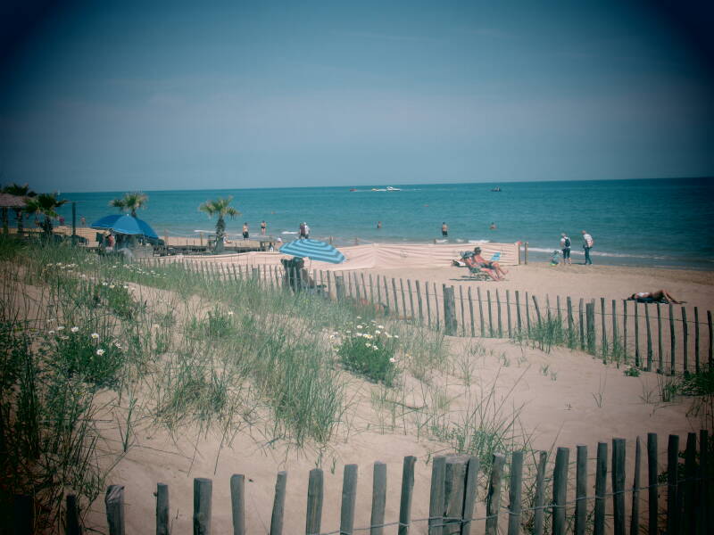 Richting Marseillan-Plage waar we een leuke camping hebben uitgezocht, Beauregard!! Om te beginnen rijden we weer eens fout, door mijn verkeerde aanwijzing moeten we een eind omrijden via le Grau, dat is geen pretje, smalle kleine straten met allerlei obstakels. De stemming wordt er niet beter op, nou maar hopen dat de camping OK is!! Uiteindelijk de goeie weg richting Sete en zo belanden we bij Maerseillan Plage. Om te beginnen schrikken we hier van, het lijkt wel een klein Playa de Aro, veel winkels en restaurants.Ook hier rijden we fout maar uiteindelijk “Beauregard”, we worden allerhartelijkst ontvangen en kunnen een plekje uitzoeken. We starten met 2 dagen en dan zien we wel weer. Voor ons is dit een supercamping, klein met zeer ruime plekken die veel privacy hebben door alle mooie bomen en struiken die er staan. Overal zijn bloemperken aangelegd, sommige met zitjes. Het sanitair is goed en verzorgd.