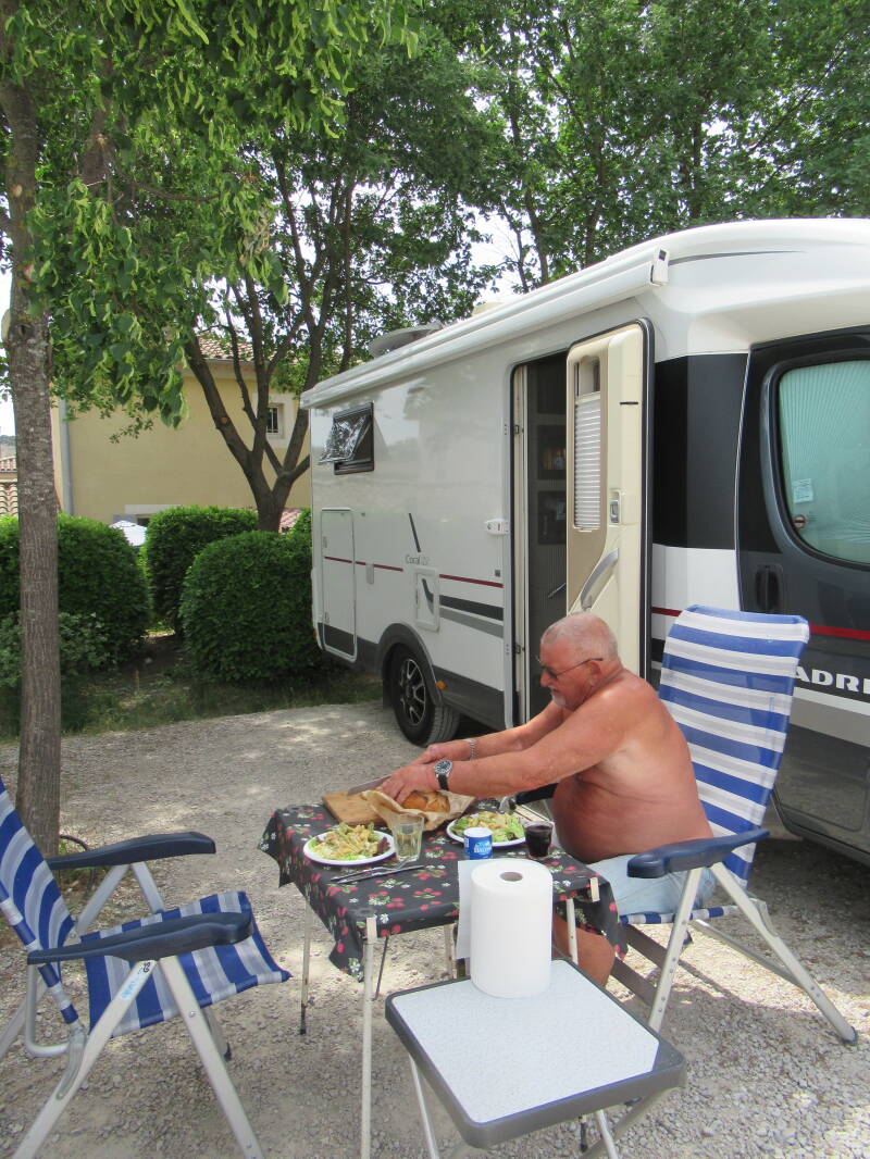 Uiteindelijk via een omweg komen we op de goede weg de D538, die we al vaker hebben gereden. We passeren Malaucene, waar we vorig jaar hebben gebivakeerd en zijn dan snel in Vaison op de bekende CP. Het is er nu om plm. 13.00 uur al redelijk vol, maar we boffen en zien een plekje met zowaar veel schaduw. Gauw geparkeerd en de stoelen naar buiten. Eerst een biertje en daarna een hapje eten gemaakt.