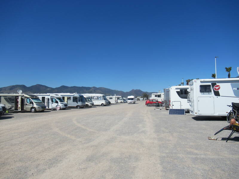 We willen gas tanken en gaan El Grau de Castello verlaten. hier vertrekken, was een heerlijke plek om te verblijven. Ook Bram gaat weer richting Nederland en Siem en Joke zwaaien ons uit. Al snel hebben we het tankstation gevonden en voor ons is het nieuw dat het gas in dezelfde unit zit als diesel en benzine. Dan koersen we richting Moncofa, Dat was niks, dus we rijden door naar Platja de Casa Blanca, we hebben gelezen dat daar een goeie CP is met een mooi uitzicht over de zee. De naaamklinkt al aantrekkelijk. Het is inderdaad een mooie plek, in een echt leeg vakantie dorp. We staan er prima alleen...... de harde wind en verder niks te beleven. Du we gaan weer verder Nu naar Platja de la Pobla de Farnals, net boven Sagunto. Dit is een betere plek vlak langs de AP7 , dus gauw gevonden. De officiële CP, waar ook service is, is vol maar we zien wat verder een groot terrein waar ook campers staan. Daar is voldoende plek.De CP ligt tussen de bebouwing en bijna geen wind. Er wordt hier volop gebouwd, luxe apartementen, heel hoog. Je ziet eigenlijk alleen hoogbouw, maar wel met veel groen erom heen. De Consum supermarkt ligt om de hoek en we kopen brood en een paar flessen wijn.