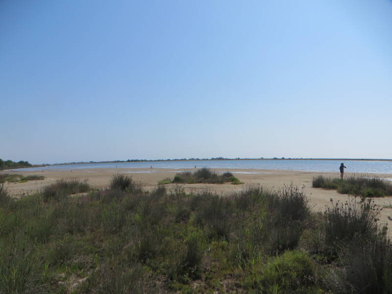 We stappen weer eens op de fiets en rijden naar het grote strand van Mateille. Vanaf hier loopt een fiets- en wandelpad door het natuurgebied naar Les Ayguades, een klein gehucht met wat vakantiehuizen en een mooi strand. Na een paar honderd meter draaien we weer om, niet te fietsen met onze e-bikes, grote stenen en kuilen, dat kost ons de banden. Echt een traject voor montainbikes. Dan rijden we weer richting Plage de Grazel langs de mooie boulevard waar het nog steeds vrij rustig is. Er zijn wat leuke straatjes en daar lopen veel mensen met weer die mondkapjes, dus wegwezen. Om de havens en het dorp heen gaan we richting Les Chalets over een lange dijk. Daar aangekomen bekijken we de CP die hier ligt en prijzen ons gelukkig dat we daar niet staan. Hutje aan mutje, dicht op elkaar op een stoffig veld, zonder enige schaduw. Het ligt wel direct aan het strand, Plage des Chalets, waar het erg druk is. Dit zagen we niet eerder. Er zijn wat strandtenten die ook vrij vol zijn. Dan maar ergens anders een drankje. Terug weer even langs de Lidl, de fietstassen vol en naar de CP. Hier smaakt een biertje heerlijk na de fietstocht. We zijn blij dat we op deze CP staan, er is voldoende ruimte, ligt direct aan het Etang, service aanwezig, wat wil je nog meer. We bellen even naar Mascha, thuis is ook alles goed, de warmte komt eraan in Nederland en dat is gunstig voor Ton, met zijn mooie terras aan het water. We zien een stukje van de persconference met Rutte, de besmettingen in Nederland nemen toe, vooral onder jongeren die willen feesten. Er wordt opnieuw gewaarschuwd, 1,5 meter afstand, veel handen wassen. In Amsterdam en Rotterdam is zelfs een mondkapjesplicht gekomen voor bepaalde delen van de stad. Onze overbuurman, een actieve man uit Limoges met zijn gezin, komt ons uitnodigen voor het aperetief voor morgen. Het zijn bijzonder actieve mensen die veel sporten bedrijven en alles gaat gepaard met een speciale uitrustig. Motoren, fietsen, surfplanken om te peddelen en tussen door oefeningen van de sportschool. Wij worden al moe van het kijken, maar het zijn erg aardige mensen. Naast ons is een campertje komen staan met een man alleen en ook hij wordt uitgenodigd, dus dat wordt frans oefenen morgen.
